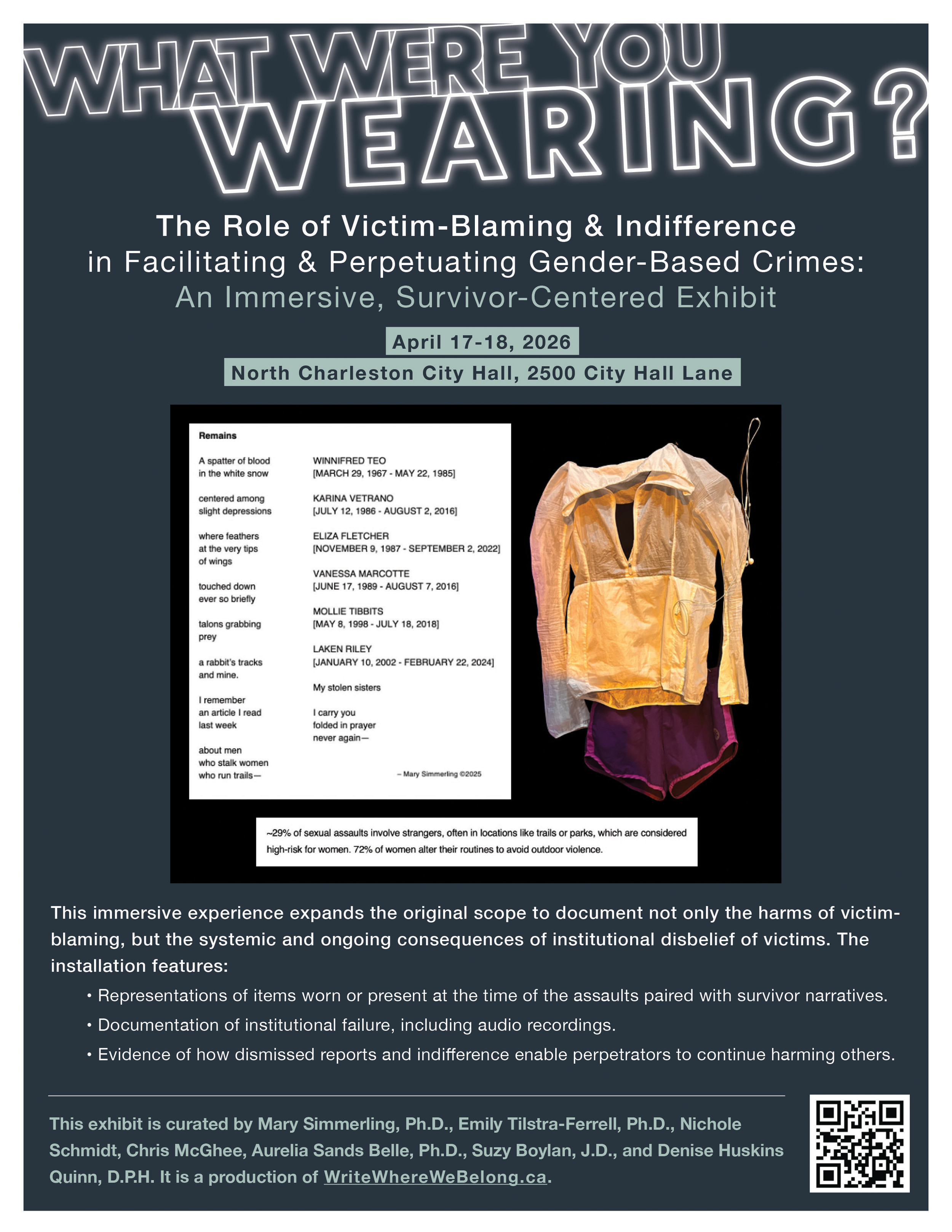 We are premiering the 2026 What Were You Wearing? exhibition on April 17–18 in partnership with the Medical University of South Carolina’s National Crime Victims Research and Treatment Center and the Mayor's Office at North Charleston City Hall, South Carolina.